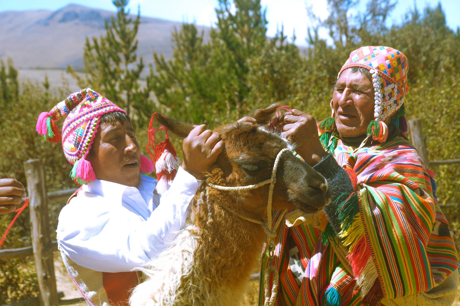 Llamas cargueras. Llamas rebeldes que se escapan de las recuas y que los arrieros encaminan lanzándole piedras. Ellos son unos capos con sus hondas, como las mujeres que utilizan champas de tierra seca para calentar sus cocinas y tiñen la lana de sus animales con semillas, frutos y otros insumos naturales. Colores únicos, colores del campo, colores andinos en los tejidos de las comuneras.